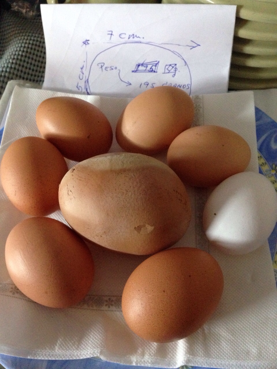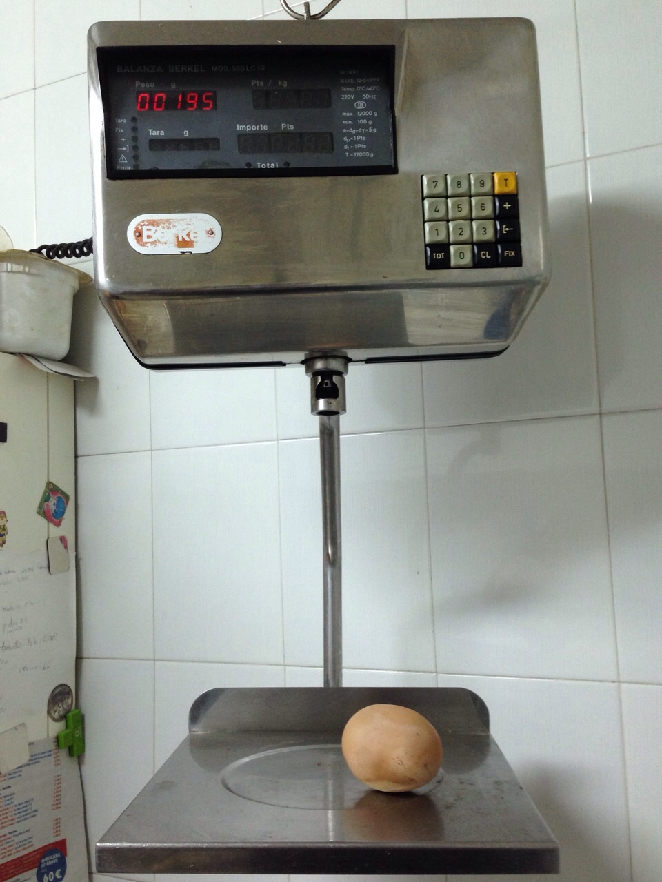 El peso muestra el peso de 195 gr. Según Jorge Cores puede ser el más pesado de España y de Europa. En Cuba una gallina puso uno de 245 gr y en China uno de 200 gr.