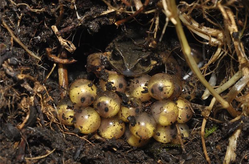 En este grupo de especies, cuyas áreas de distribución son muy reducidas, parece que suelen ser los machos los encargados del cuidado de los huevos, de los que salen diminutas ranas totalmente formadas. El elevado número de huevos que se encuentran en los nidos de P. teqta sugiere que un solo individuo se encargaría de las puestas de más de una hembra.