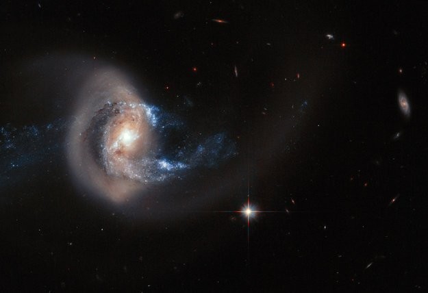 NGC 7714 es una galaxia espiral situada a 100 millones de años luz de la Tierra (relativamente cercana en términos cósmicos). Esta galaxia ha sufrido una serie de procesos dramáticos y violentos en su pasado más reciente y las pruebas de esta brutalidad las podemos encontrar en la extraña forma de los brazos de NGC 7714 y en la neblina dorada que se extiende desde su centro galáctico.