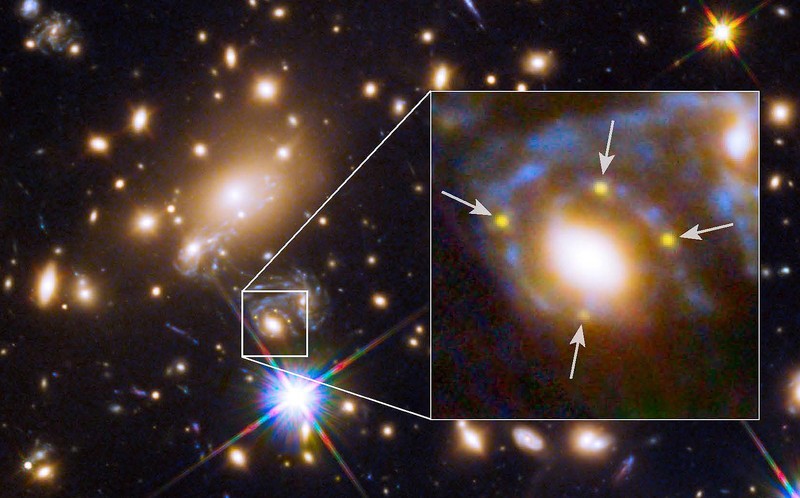 Hace 50 años, se predijo que la luz de una explosión estelar podría seguir varios caminos a la vez alrededor de una lente gravitacional. Los astrónomos acaban de encontrar ese escenario en un cúmulo de galaxias, donde la luz de una remota supernova se presenta en cuatro imágenes en forma de cruz frente al telescopio espacial Hubble. El hallazgo ayudará a medir la expansión cósmica y poner a prueba la teoría de la relatividad general de Einstein, que ahora cumple cien años.