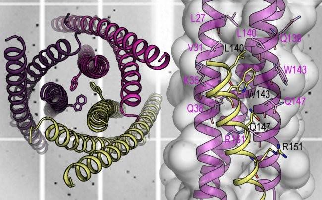 Científicos andaluces han descubierto, usando los brillantes rayos X del Sincrotrón ALBA de Cerdañola del Vallés (Barcelona), la estructura cristalina de una cadena proteica sintética que es eficaz para evitar la infección del VIH-1, la cepa más común y patogénica del virus de la inmunodeficiencia humana. Estructura cristalográfica de la cadena proteica. Representación de la superposición de la proteína dentro del modelo teórico del ectodominio gp41 (Ana Cámara, Universidad de Almería).