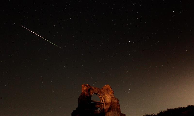 Fotografía de larga exposición que muestra un meteoro mientras cruza el cielo. Imagen tomada desde la basílica cristiana bizantina "Iglesia Roja", que data del siglo IV y V, en Perushtitsa (Bulgaria)