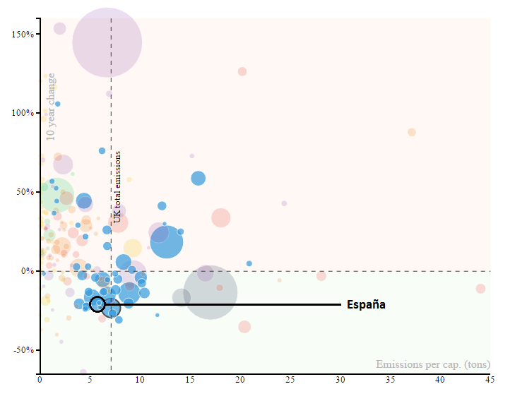 Las burbujas de color azul muestran cómo la mayoría de países comunitarios han experimentado una caída neta de dicho indicador a lo largo de la última década. Especialmente positivo es el lugar que ocupa España, que se coloca en los puestos de cabeza en la caída de las emisiones per cápita para el periodo analizado.
