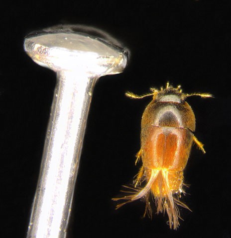 Es un minúsculo escarabajo, de un milímetro de longitud, que ha sido hallado en agua estancada junto a plantas de jengibre y plátanos. A los científicos les sorprende que no viva en la tierra, como la mayoría de sus compañeros de especie. Fue visto por primera vez en Perú.