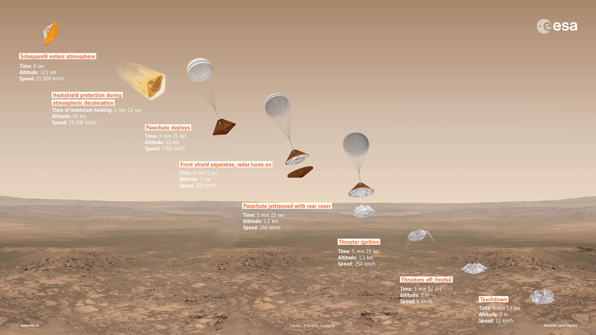 Durante ese tiempo redujo su velocidad desde los 21.000 km/h a 3 m/s mientras entraba en la atmósfera marciana protegido por un escudo térmico. Frenó su caída con un paracaídas de 12 metros, y parece que, alrededor del momento en que este y el escudo térmico superior se separaron de la nave, algo sucedió. Parece que ese desprendimiento se produjo antes de lo previsto, aunque el análisis aún no ha concluido.