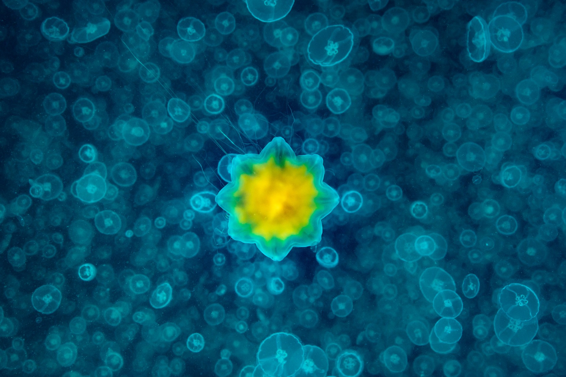 El fotógrafo encontró esta brillante medusa entre miles de pequeñas medusas en las aguas de Alaska. Cuenta que emergió justo ante el objetivo y que sólo tuvo que disparar. El jurado premió la composición de la foto, combinando azules y dorados con las formas geométricas de los animales.