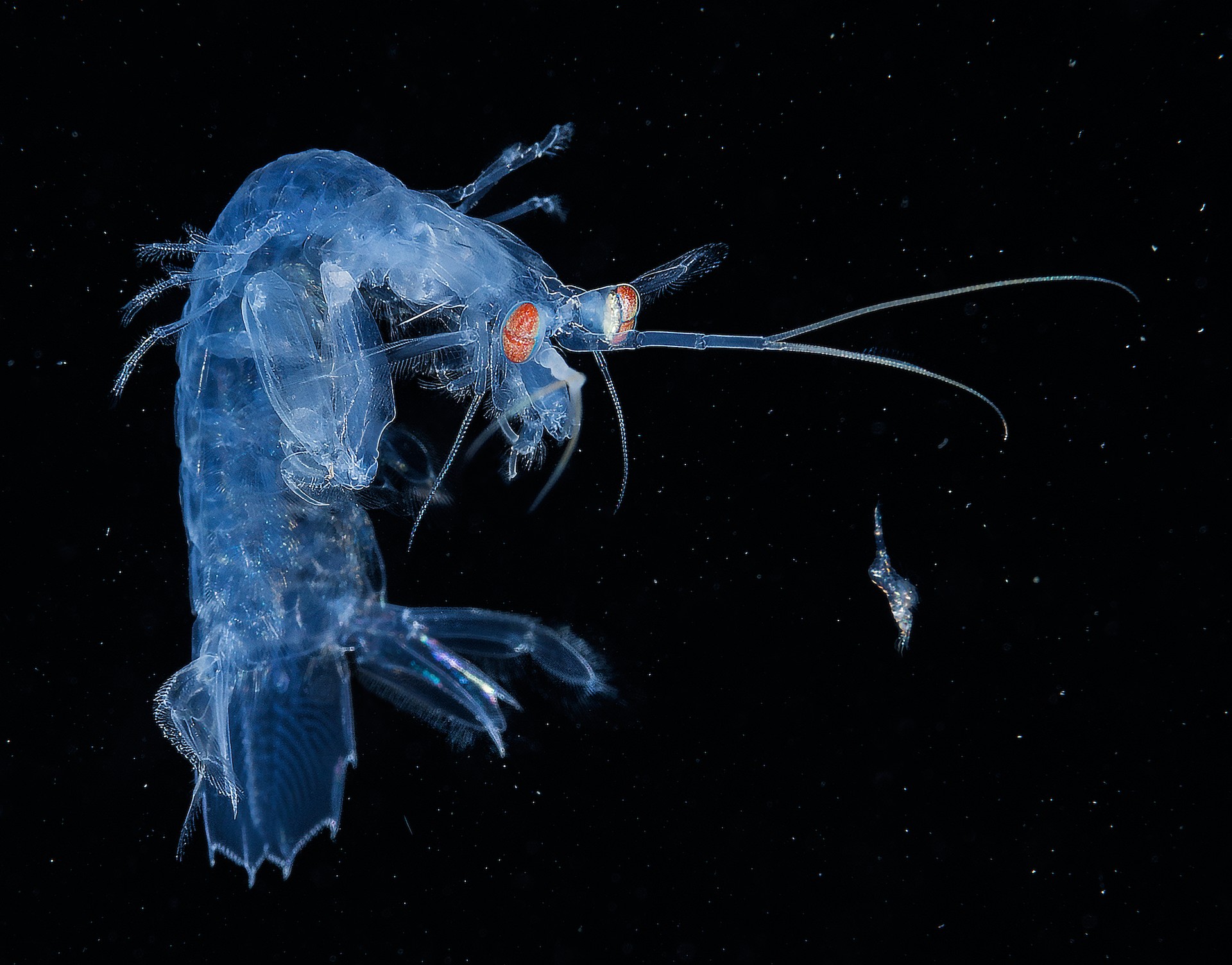 La foto fue tomada durante el rodaje de un documental sobre ballenas en Sudáfrica. El fotógrafo se sumergió en un banco de krill cuando apareció un gigantesco ejemplar a muy poca distancia.