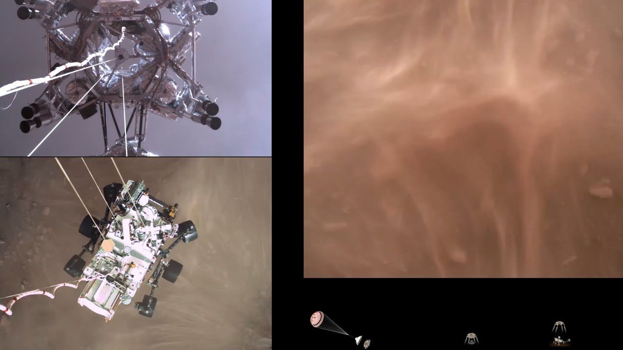 Las imágenes reales fueron capturadas por varias de las cámaras instaladas en el rover. Las vistas incluyen una cámara que mira hacia abajo desde la etapa de descenso de la nave espacial (una especie de contenedor propulsado por cohetes que ayuda a llevar el rover a su lugar de aterrizaje), una cámara en el rover mirando hacia arriba en la etapa de descenso, una cámara en la parte superior de la coraza (una cápsula que protege el rover) mirando hacia ese paracaídas, y una cámara en la parte inferior del vehículo mirando hacia la superficie marciana.