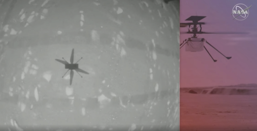 Una cámara en el rover Perseverance, que desplegó el pequeño helicóptero de 1,8 kilos de peso en el cráter Jezero de Marte, registró en imágenes tomadas desde 60 metros de distancia cómo Ingenuity movía las palas de sus rotores y posteriormente se encontraba suspendido en el aire.