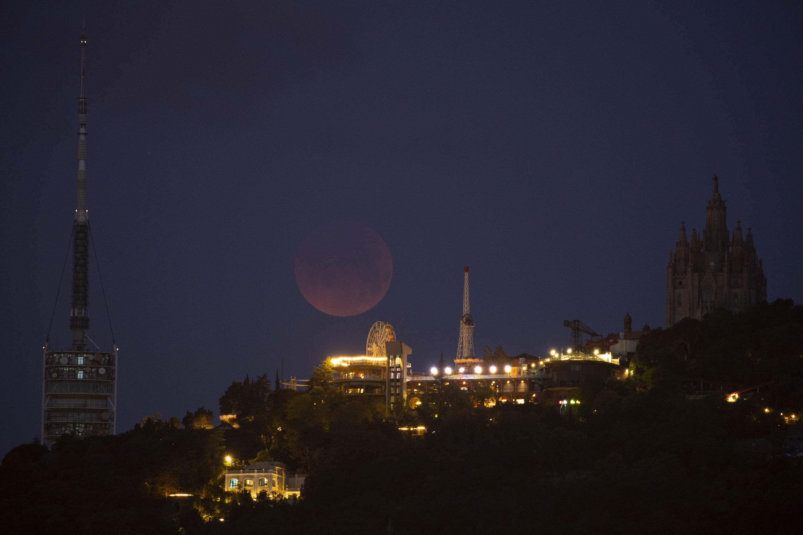 Vista del eclipse total de Luna tras el parque de atracciones del Tibidabo, la madrugada de este lunes.