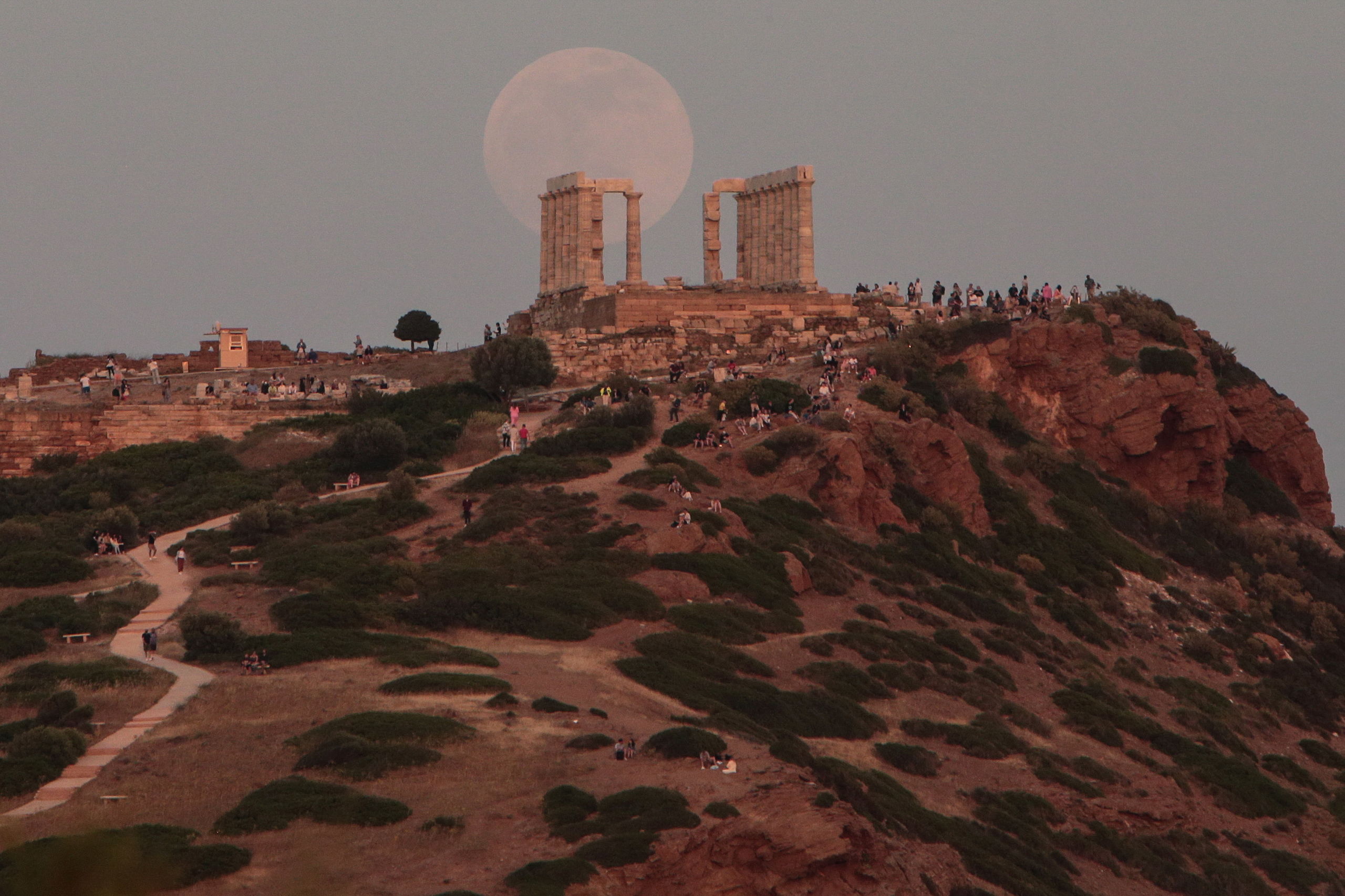 La luna llena se eleva sobre el templo de Poseidón, un día antes del eclipse lunar, en Cabo Sounio, a 65 km al sur de Atenas, Grecia.