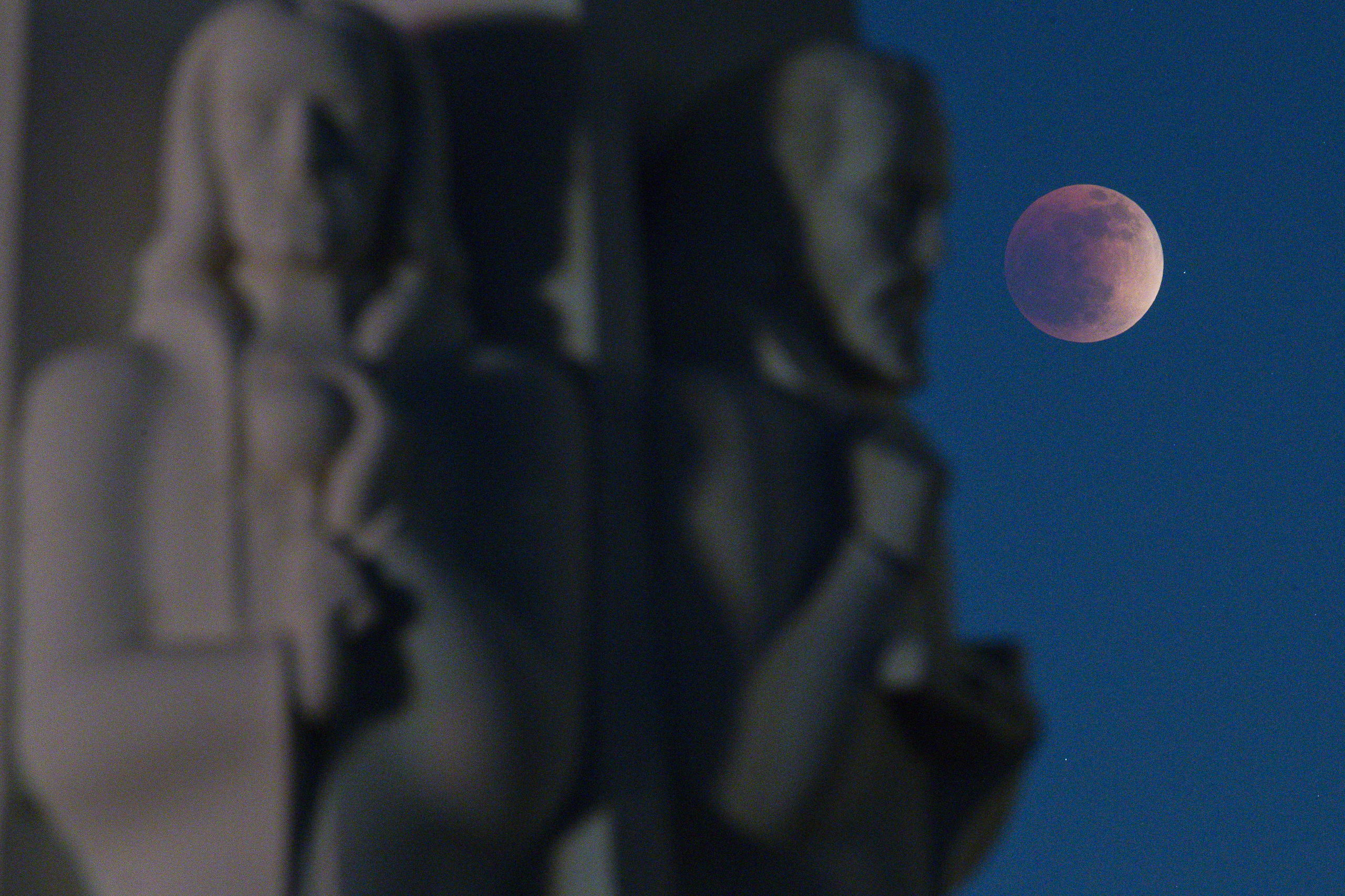 El eclipse lunar se asoma detrás del 'Monumento a los astrónomos', en el Observatorio Griffith en Los Ángeles, California, EE. UU.
