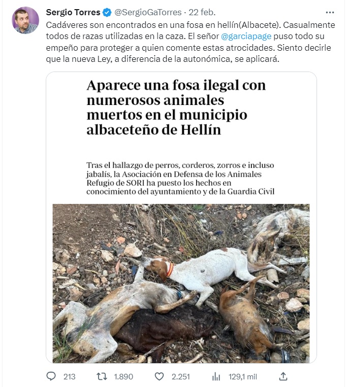 "Cadáveres son encontrados en una fosa en Hellín (Albacete). Casualmente todos de razas utilizadas en la caza. El señor García Page puso todo su empeño para proteger a quien comente estas atrocidades. Siento decirle que la nueva Ley, a diferencia de la autonómica, se aplicará", publicó en Twitter García Torres haciendo referencia a la nueva ley de Bienestar Animal y a la oposición que ha manifestado el presidente de Castilla-La Mancha.