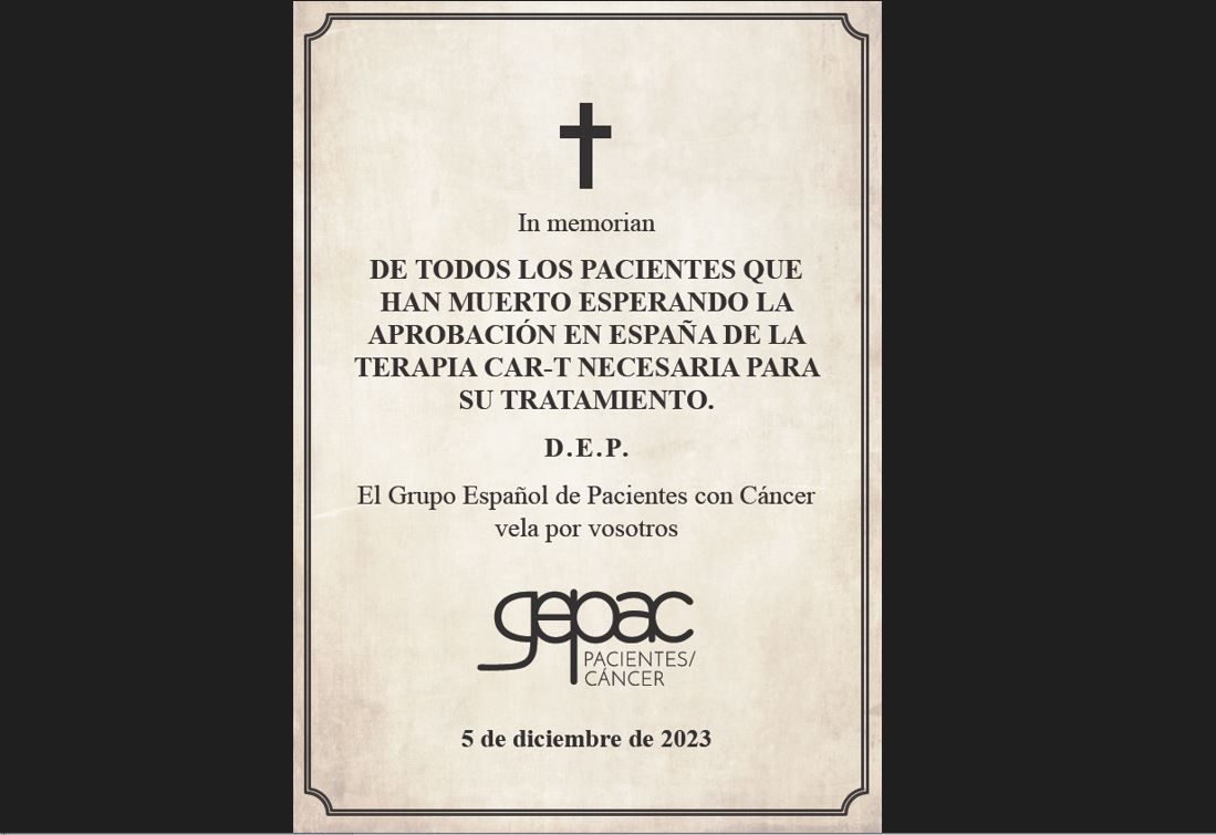 Además de la esquela, el Gepac ha adjuntado una carta en la que expresan a la ministra su "preocupación" por las demoras en la aprobación de tratamientos y pruebas diagnósticas y, en concreto, sobre las terapias CAR-T, aprobadas por la Agencia Europea del Medicamento (EMA) en diciembre de 2020 para algunos tipos de linfoma y disponible en 13 países europeos, "excluyendo lamentablemente a España".