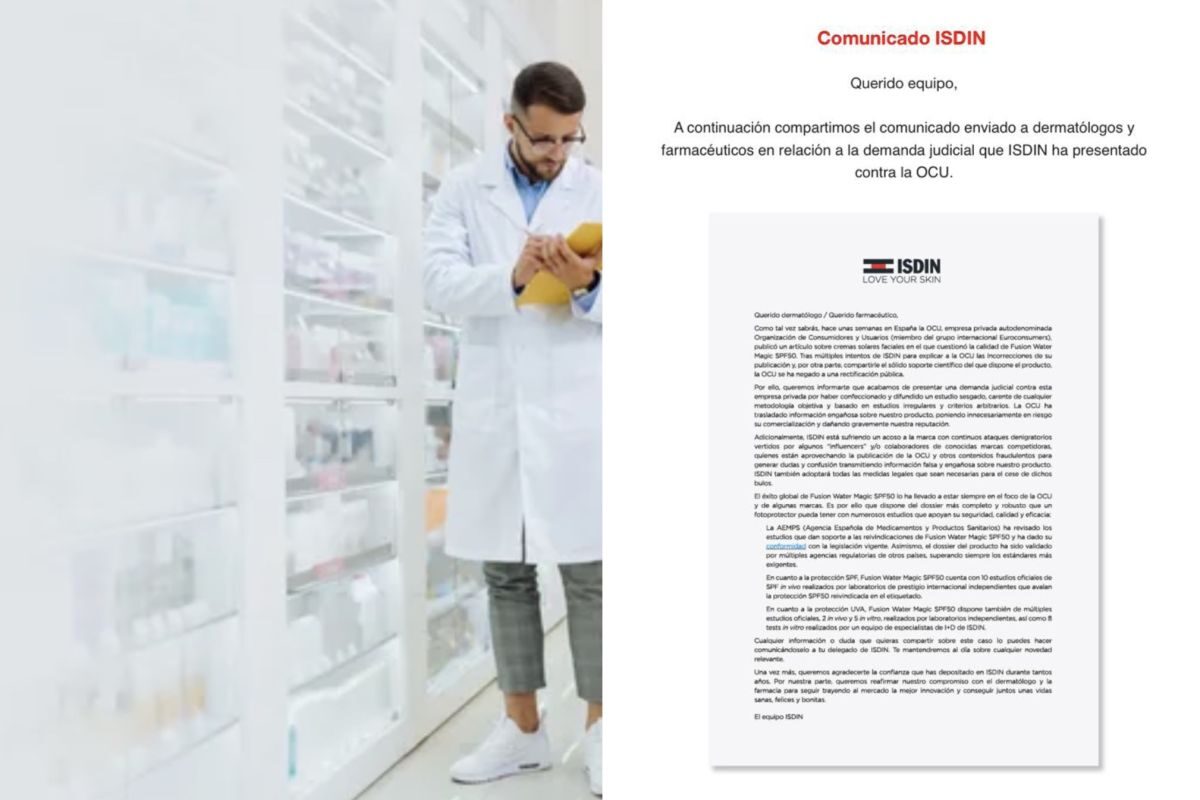 La carta informa a las farmacias el motivo de la demanda contra la OCU: "Queremos informarte de que acabamos de presentar una demanda judicial contra esta empresa privada por haber confeccionado y difundido un estudio, sesgado, carente de cualquier metodología objetiva y basado en estudios irregulares y criterios arbitrarios". Además, esta asegura que el informe sobre fotoprotección de la OCU está siendo utilizado en "un acoso a la marca con continuos ataques denigratorios vertidos por algunos 'influencers' y/o colaboradores de conocidas marcas competidoras".