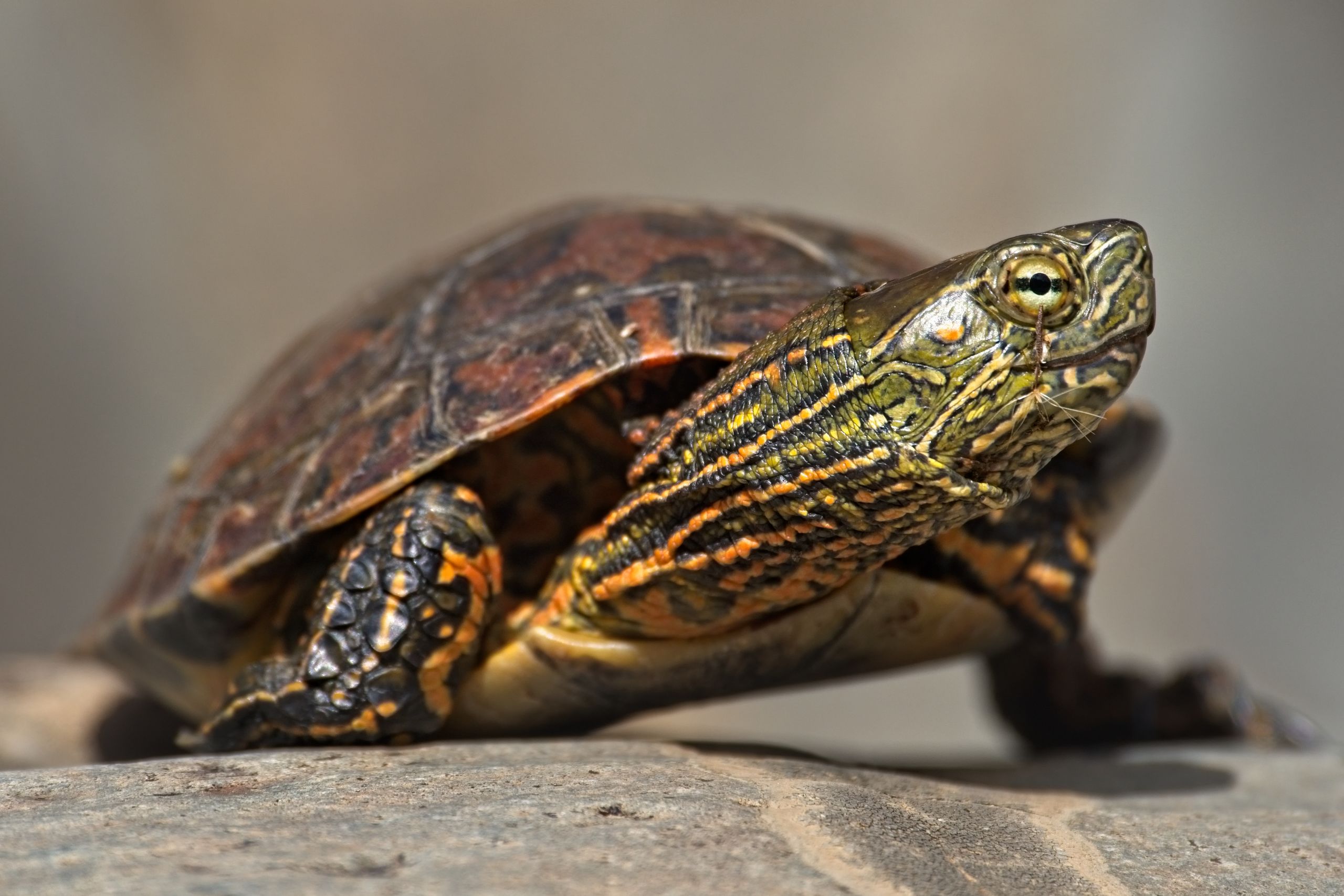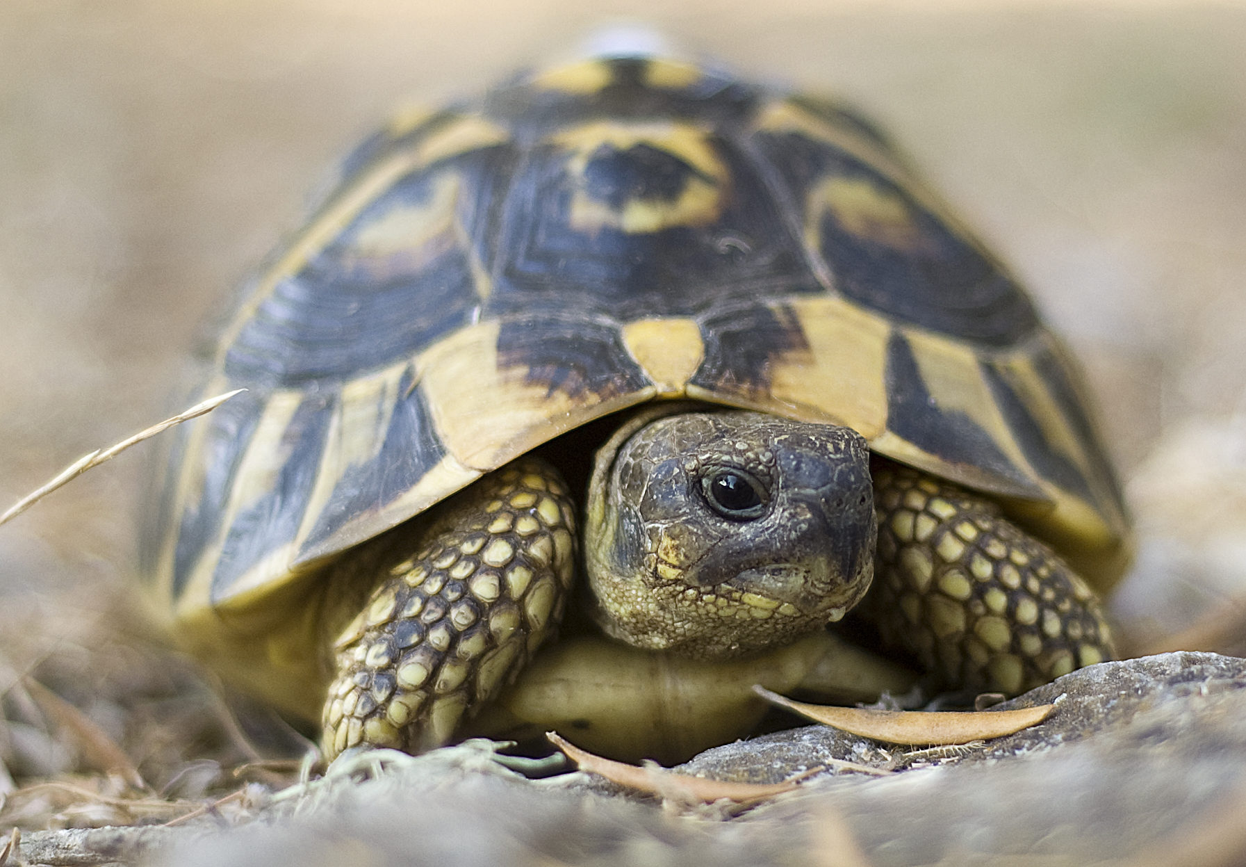 La segunda y última especie terrestre en el país. Los machos son más pequeños, con unos 15 centímetros de longitud y las hembras pueden alcanzar los 18. En estado salvaje no suelen superar los 20 años de vida, pero en cautividad pueden alcanzar incluso los 60. Es una especie ligeramente amenazada.