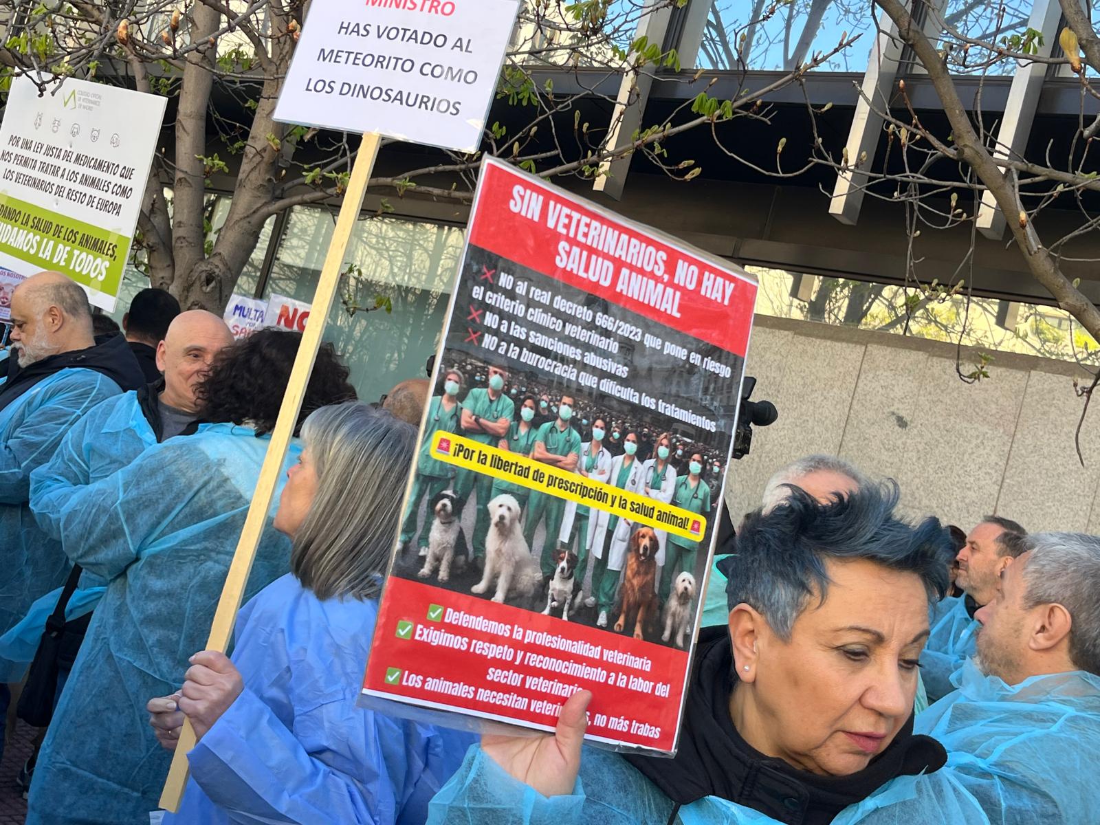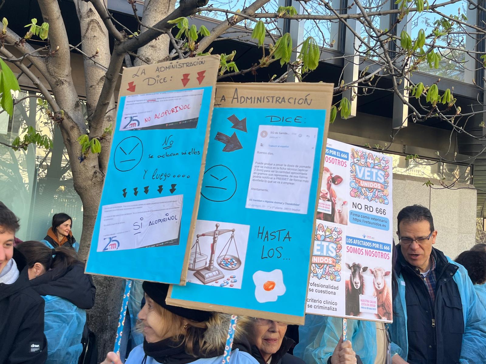 “No al real decreto 666/2023 que pone en riesgo el criterio clínico veterinario. No a las sanciones abusivas. No a la burocracia que dificulta los tratamientos. Defendemos la profesionalidad veterinaria. Exigimos respeto y reconocimiento a la labor del sector veterinario. Los animales necesitan veterinarios, no más trabas”