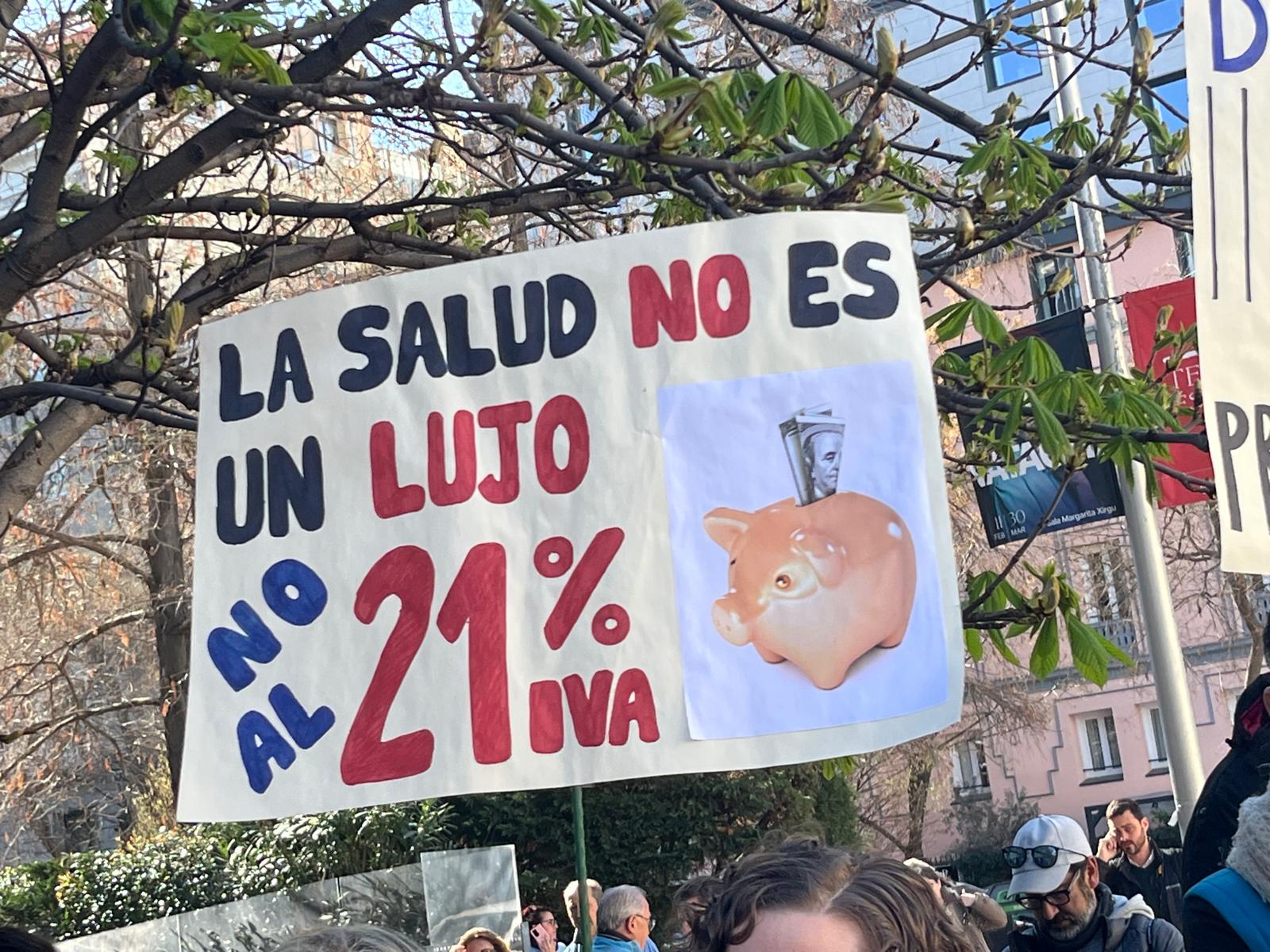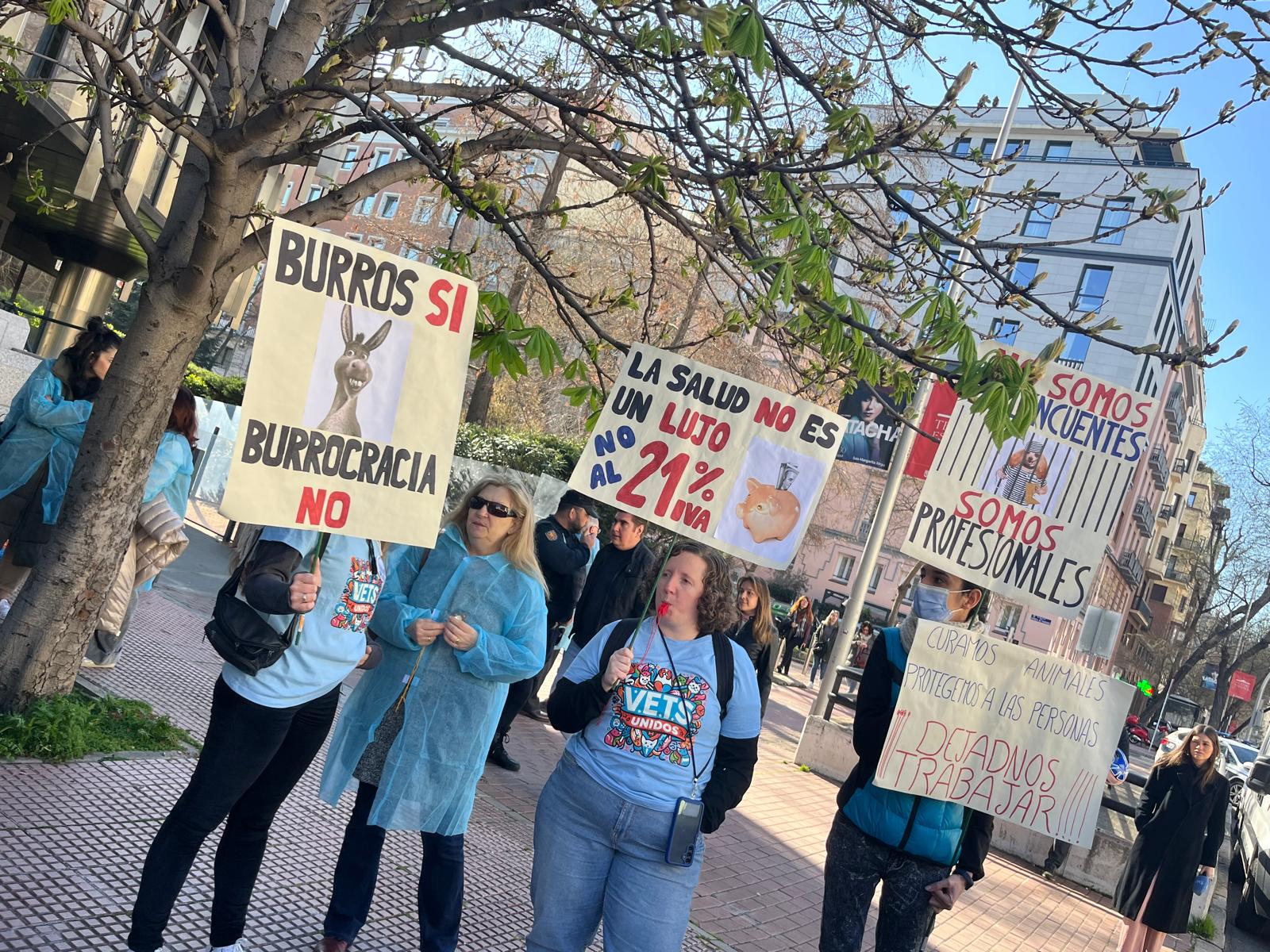“La salud no es un lujo, no al 21% de IVA". Los profesionales han aprovechado la manifestación para denunciar el aumento que se incorporó hace unos años de 13 puntos en el IVA, aumentando de un 8% a un 21%, equivaliendo así la asistencia veterinaria a un artículo de lujo.