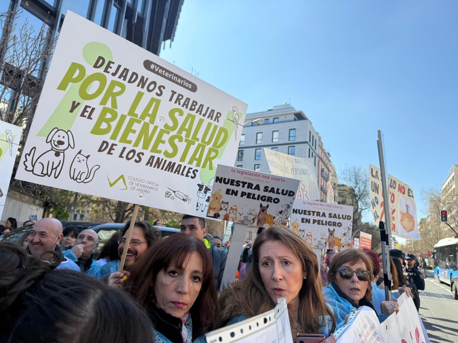“No somos delincuentes somos profesionales". Los veterinarios han acudido a la manifestación para luchar por sus derechos y su profesión para prescribir medicamentos bajo su conocimiento y experiencia de forma adecuada.