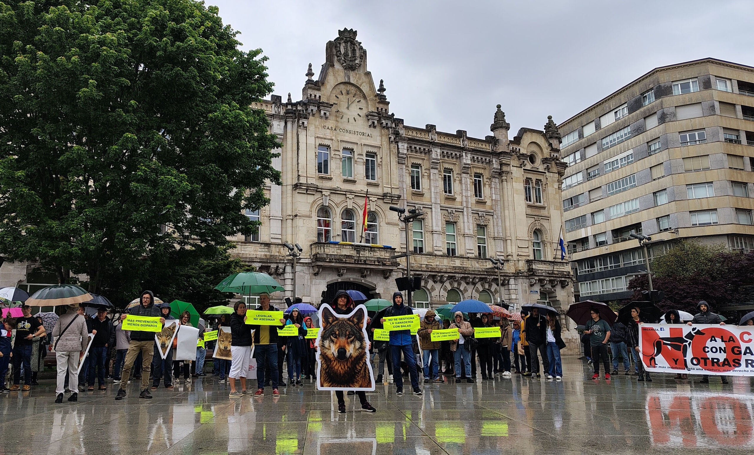 Durante la concentración, que ha tenido lugar al mediodía bajo la lluvia, se han podido leer consignas en pancartas como 'Ni un disparo más, ni un lobo menos', 'Lobo vivo, lobo protegido', 'Disparar lobos no soluciona la coexistencia' o 'Los lobos equilibran los ecosistemas', y se ha hecho lectura de un manifiesto que ha concluido con un aullido conjunto simulando el del cánido.