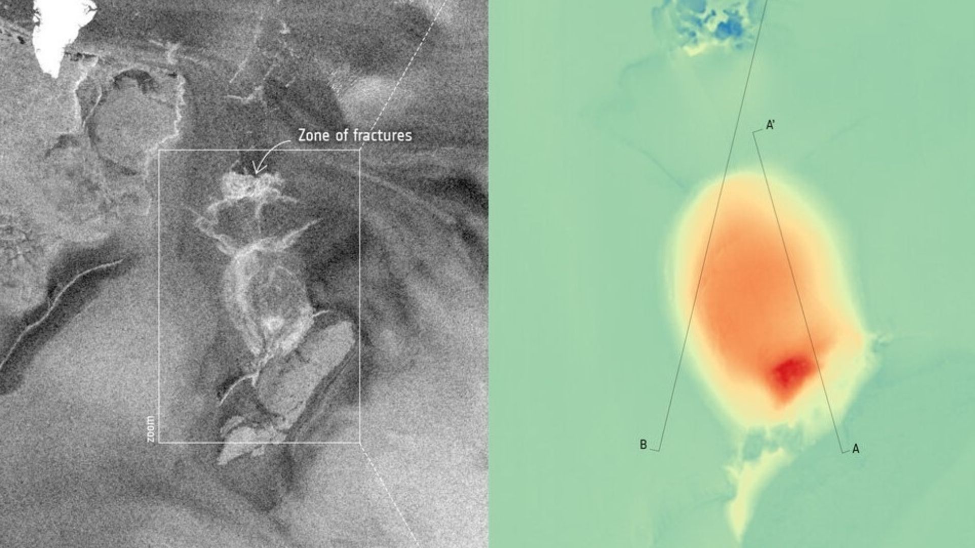 La liberación repentina de agua no solo formó el cráter, sino que provocó daños visibles en la capa de hielo, incluida la formación de grietas profundas y el arranque de bloques de hielo de hasta 25 metros de altura. Según el estudio, la superficie helada resultó erosionada por la fuerza hidráulica de la inundación, que viajó a través de fisuras verticales generadas por la presión acumulada.