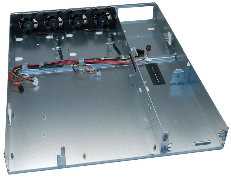 En él se pueden apreciar los tres elementos, además de los cuatro ventiladores que refrigeran el equipo. El disco duro (arriba a la derecha) está montado sobre raíles para poder extraerlo con facilidad desde fuera.