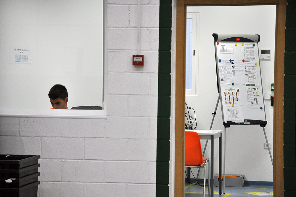 En una de las pocas habitaciones del centro, un hombre realiza su trabajo. De fondo, una pizarra con instrucciones.