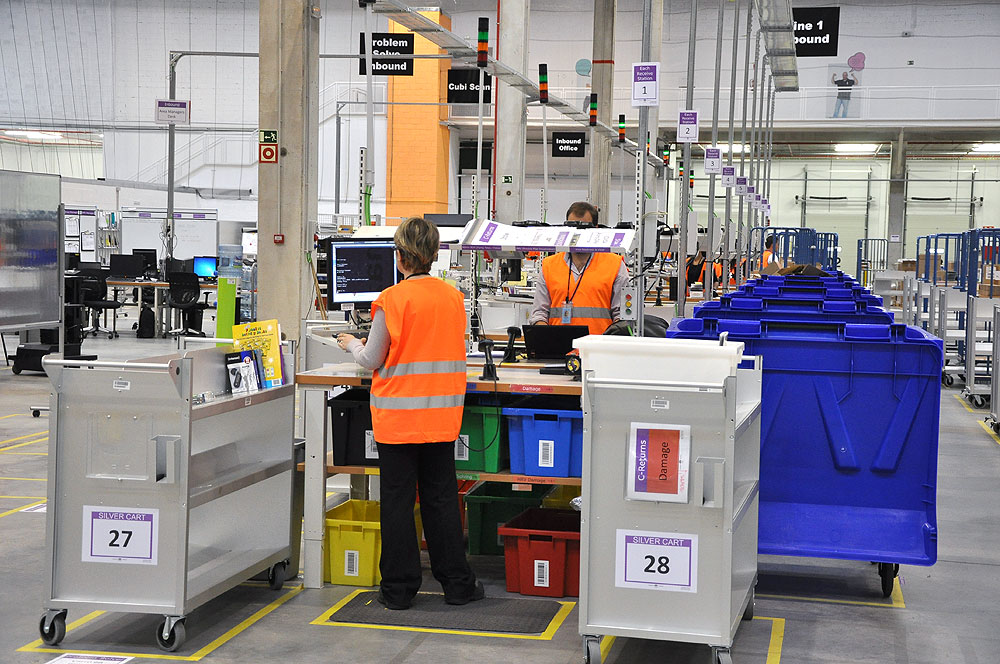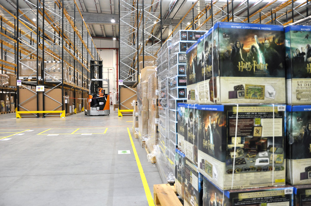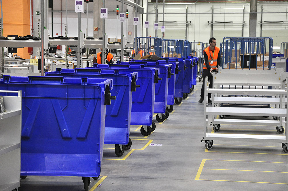 Las estanterías y carritos de diferentes formas y tamaños son muy comunes en el centro logístico.