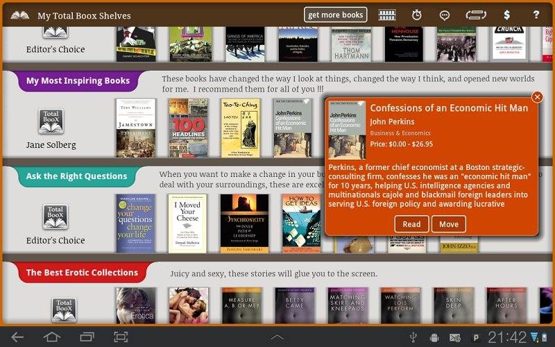 La aplicación de Total Boox, disponible en Google Play, permite a los usuarios disponer de una biblioteca virtual con todo su catálogo, pero sólo pagar por lo que realmente se lee: si lees, pongamos, un 10% del libro, pagarás sólo el 10% del precio. El lector hace un depósito inicial y se le va descontando dinero según su consumo.