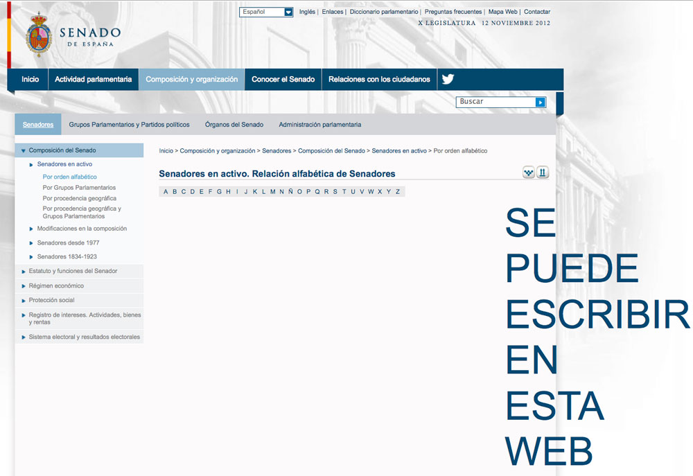 La nueva web del Senado, que acaba de ser presentada y abierta al público, ha dejado al descubierto un error que permite en uno de sus apartados escribir cualquier mensaje de texto de forma simple, añadiendo el texto al final de la dirección www.senado.es/web/composicionorganizacion/senadores/composicionsenado/senadoresenactivo/consultaordenalfabetico/index.html?id=