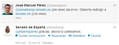 Además, otro de los fallos que han sido encontrados aparece al abrir la dirección senado.es en el navegador. Esta dirección dirige a una página no encontrada y no a www.senado.es
