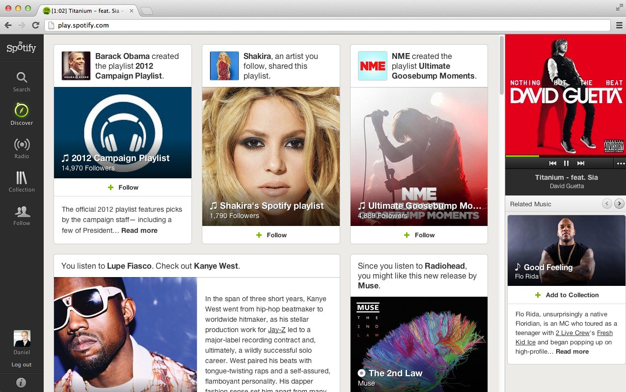 Otra nueva pestaña ha puesto Spotify al servicio de sus usuarios. En este caso, es la pestaña Discover que combina la tecnología e interacción social para mostrar al cliente el contenido más relevante. Esta incluye nuevas canciones y discos de artistas y creadores de tendencias a los que el usuario sigue y recomendaciones basadas en el historial de reproducción.