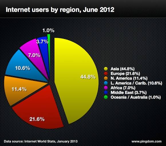 La firma analista sobre la actividad y el rendimiento de Internet, Royal Pingdom, ha realizado un estudio sobre la actividad en la red durante el año 2012. En cuanto a usuarios, 2012 ha cerrado con 2.400 millones de usuarios a nivel mundial. Asia es el continente que encabeza la lista de lugares con más internautas. El continente asiático posee ya 1.100 millones de usuarios, lo que supone casi la mitad del total global. Le sigue Europa con 519 millones y Norteamérica con 274,4 por ciento.