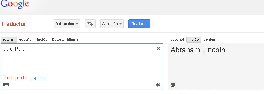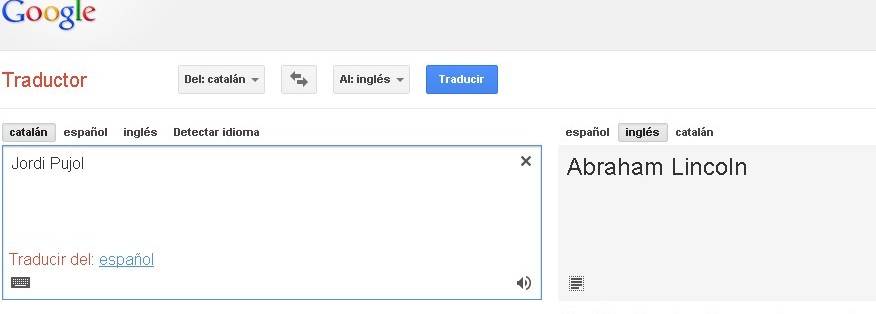 El traductor de Google confunde al expresidente de la Generalidad, Jordi Pujol, con el decimosexto presidente de EEUU, Abraham Lincoln. Este error solo se produce si se introduce el nombre en catalán y se traduce a cualquier otro idioma.