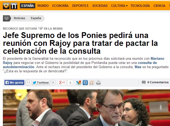 La extensión Sustitu.CAT, creada por el programador asturiano David Fernández, ha sido creada para no leer nunca más la palabra "Cataluña" o "independencia" en nuestro navegador Chrome. Su funcionamiento es sencillo: sustituye esas palabras por otras más divertidas. En concreto, Cataluña se transforma en Ponilandia y los catalanes en ponies. Artur Mas se convierte en el jefe supremo de los ponies, independencia en fiesta parda, la vía catalana en el corro de la patata y el estado independiente por un estado brillante como la purpurina.