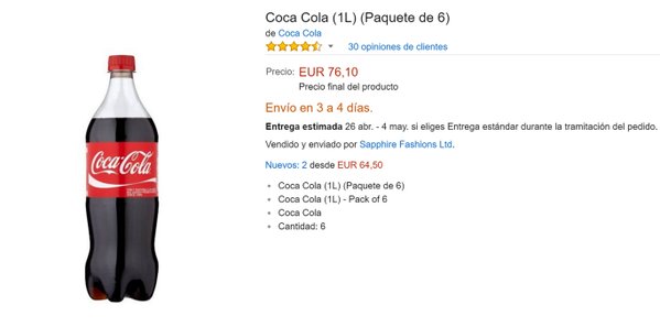 Seis botellas de Coca-Cola por 76 euros, a más de 12,5€ por litro, es decir, unas 18 veces lo que habitualmente cuesta un formato similar. Era el "ofertón" que, es de suponer que por error, apareció en el supermercado de Amazon a principios de esta semana y que se ha convertido en una broma viral.