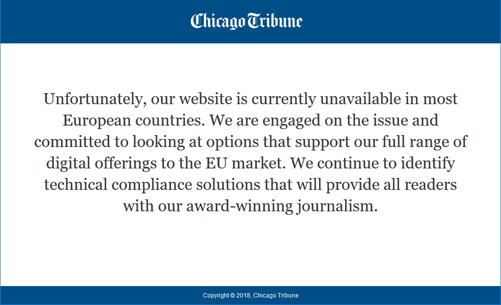 La legislación, recién en vigor, ha restringido la entrada de los usuarios de Europa a numerosos medios del país norteamericano, incluyendo Los Angeles Times, The Chicago Tribune y The New York Daily News. Otros medios, como el The Washington Post o Time, optaron por la vía de pedir el consentimiento de los propios lectores para usar sus datos, tal como se había hecho hasta la entrada en funcionamiento de la GDPR.