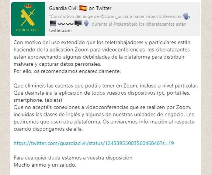 La Guardia Civil publicó un mensaje hace unos días en las redes sociales en el que hacía alusión al auge de este programa para la realización de videoconferencias múltiples, tanto para cuestiones personales como profesionales, y advertía de que el Centro Criptográfico Nacional, organismo dependiente del CNI, había informado de que ese programa tenía vulnerabilidades que podían suponer un riesgo para sus usuarios.