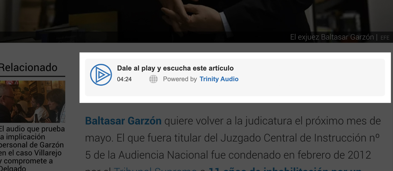 Trinity Audio permite ofrecer los contenidos escritos en formato de audio, con una voz natural, prácticamente en tiempo real ya que tan pronto como el artículo esté escrito y publicado estará disponible en este novedoso formato. Además, el lector que así lo desee puede seleccionar varios idiomas (inglés, francés, italiano y chino) pulsando en el icono que representa un globo terráqueo.