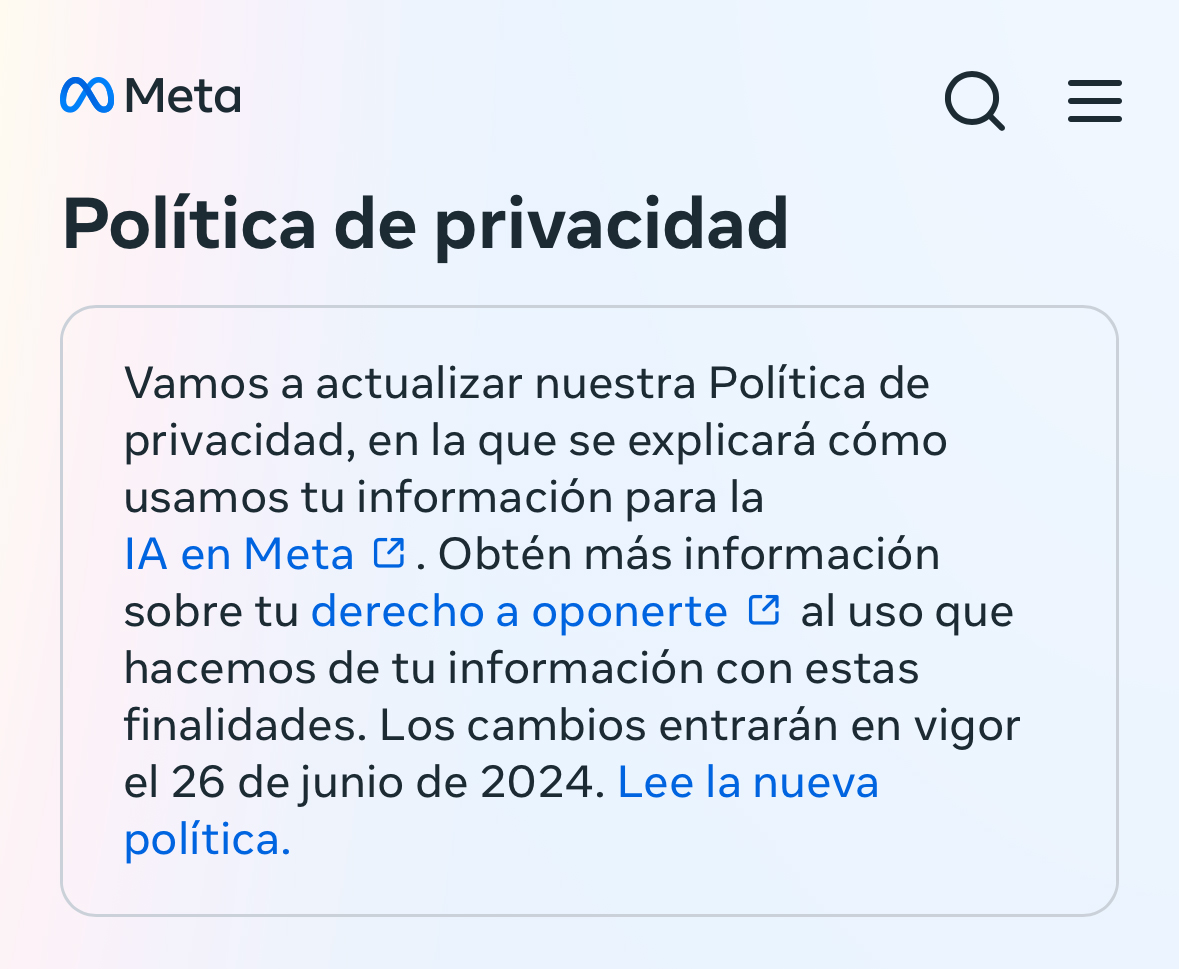 6.- En primera posición tienes un aviso en el que se te dice que se va a actualizar y se hace referencia a la IA en Meta. En esta primera pantalla, pulsa en el enlace de derecho a oponerte que aparecerá en el primer párrafo.