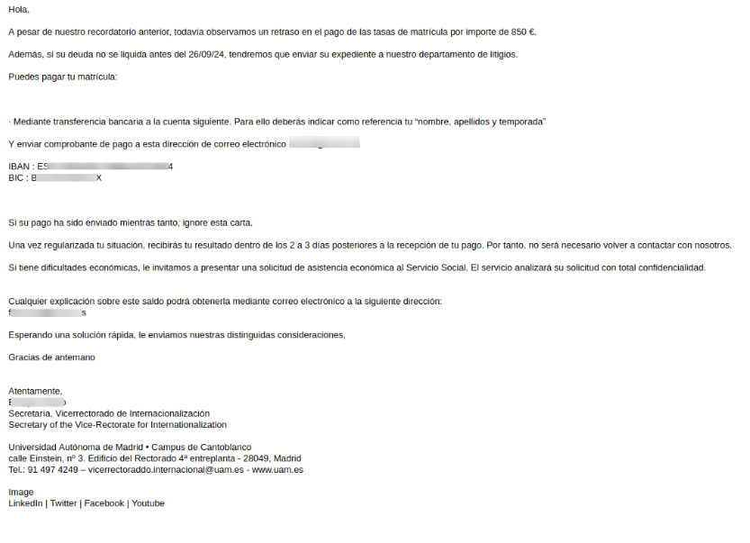 Esta campaña es una más de lo conocido como phishing –suplantación de identidad–, en la que se hacen pasar por diversas entidades universitarias para enviar correos electrónicos con asuntos relacionados con la falta de pago de la matrícula. En dichos correos, se indica un número de cuenta al que debe realizarse el pago y se solicita que el comprobante sea enviado a una dirección de correo electrónico específica.
