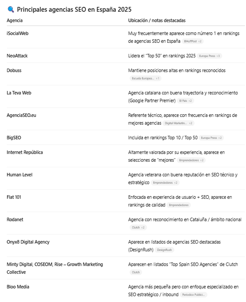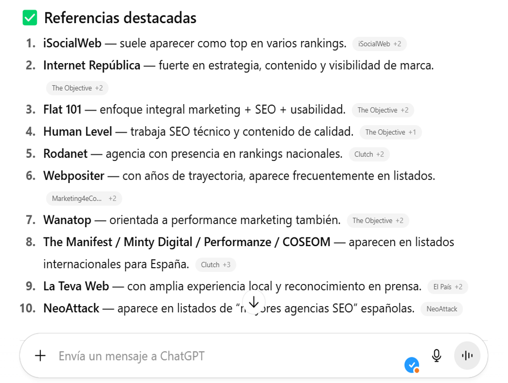 "Las mejores agencias de SEO de España en 2025 según ChatGPT son:"