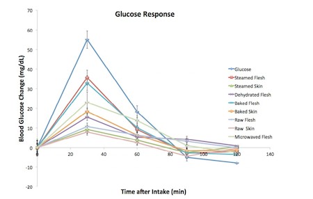 Las curvas con picos más altos son las peligrosas, y corresponden al boniato sin piel al vapor o hervido. Las curvas más sanas son las de la piel sola, y entre medias está asado al microondas.