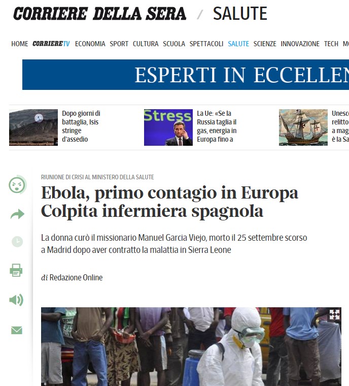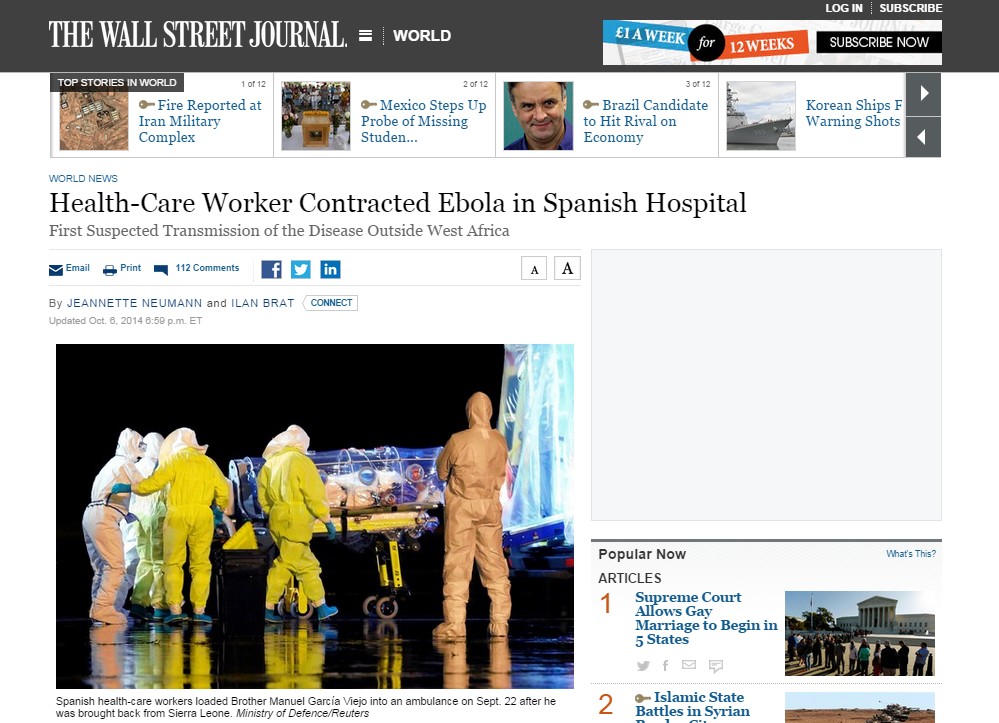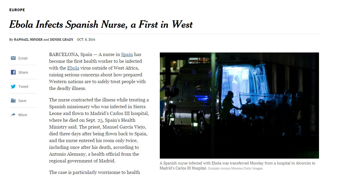 The Times titula "El ébola llega a Europa en una enfermera española infectada".
