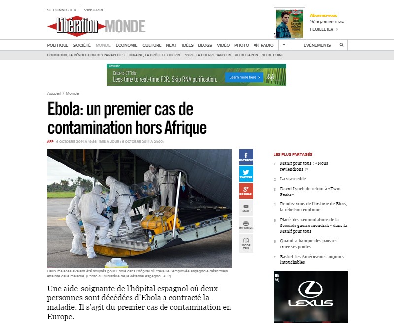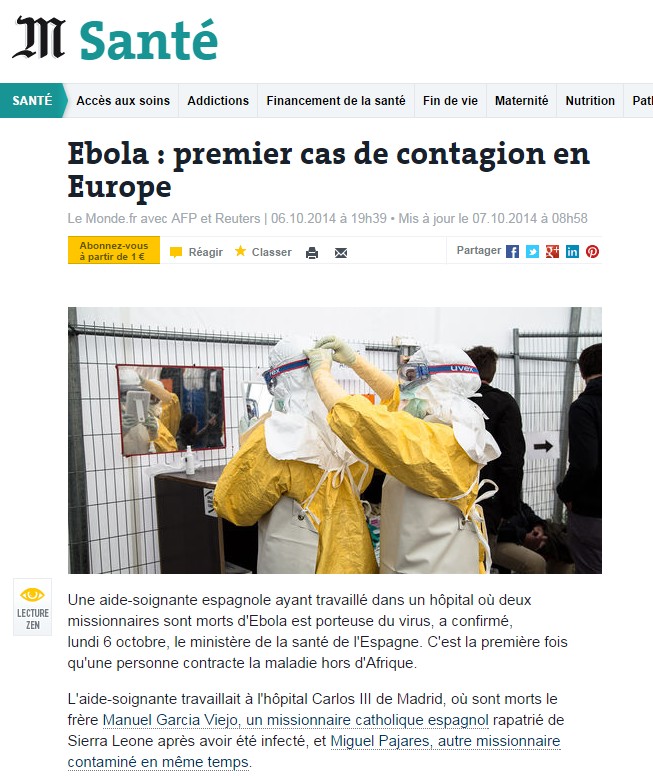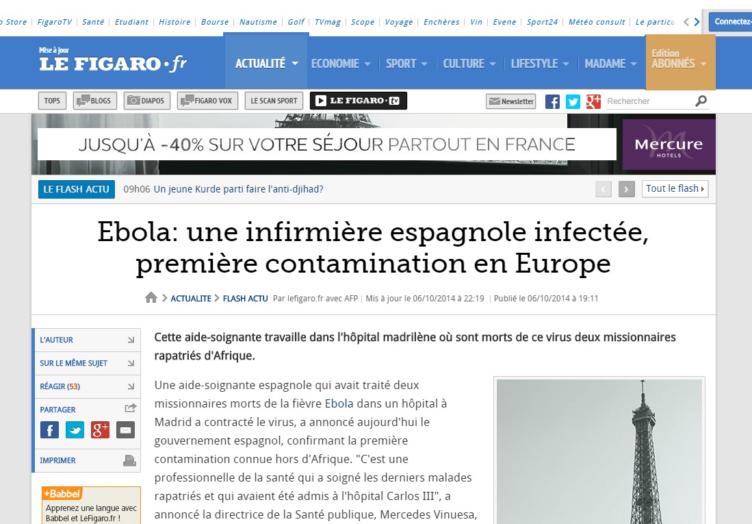El diario francés Le Figaro titula "Ébola: una enfermera española infectada, la primera contaminación en Europa"