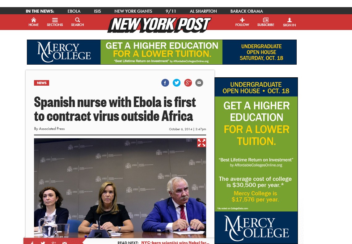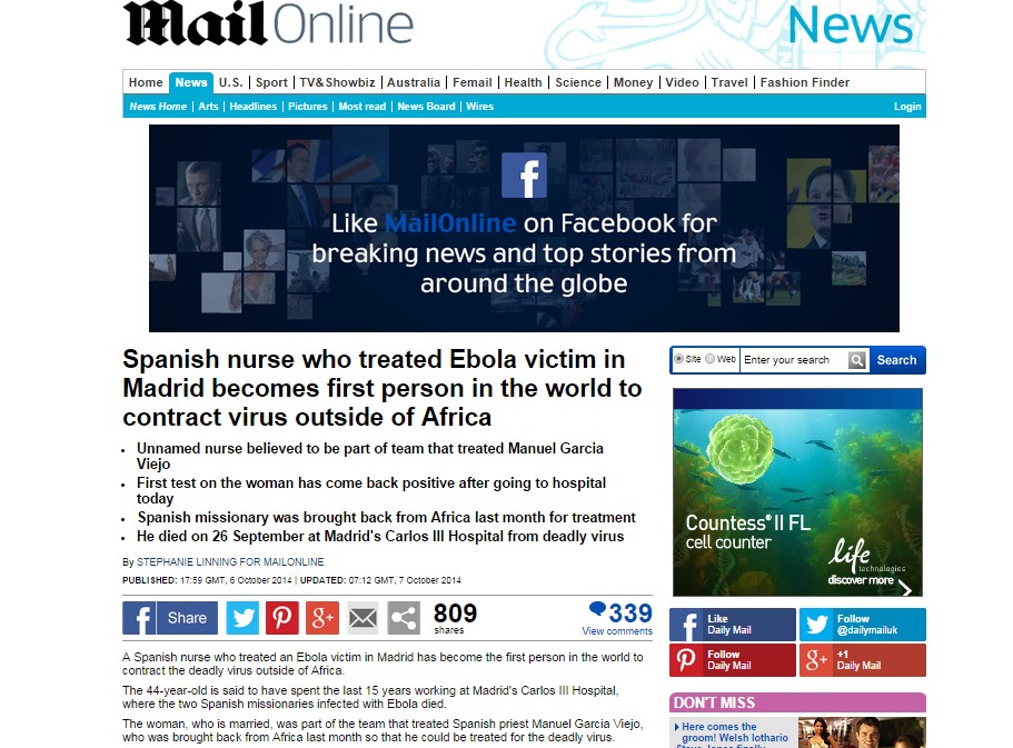 El británico titula: "La enfermera española que trató a una víctima del ébola en Madrid se convierte en la primera persona en el mundo en contraer el virus fuera de África".