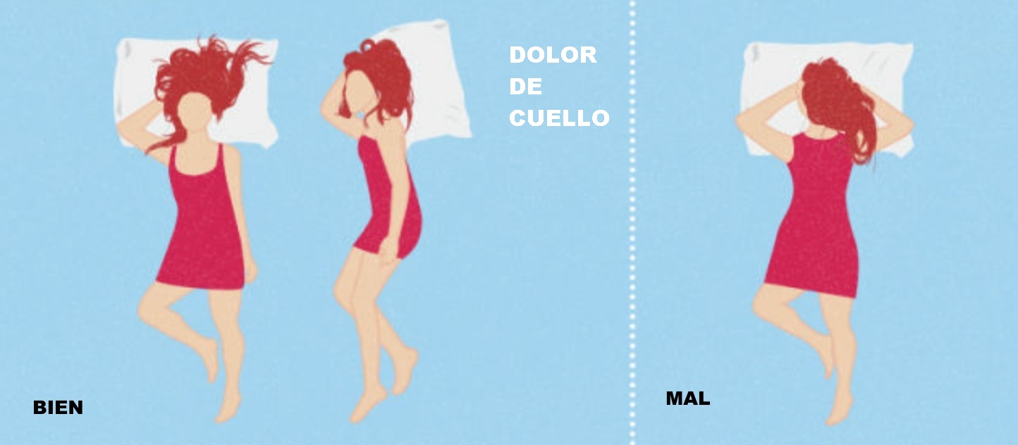 Dolor de cuello - Bien: Usa siempre una almohada de plumas o una toalla enrollada que ayude a mantener la curva del cuello. Mal: Boca abajo con el estómago.