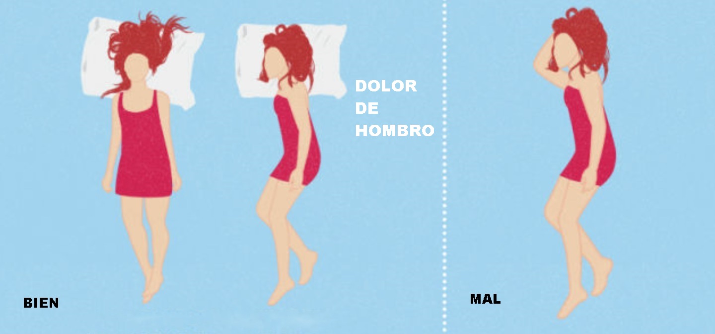 Dolor de hombro - Bien: Usa una almohada para apoyar el hombro. Evita poner peso sobre él. Mal: De lado sin el apoyo de la almohada.