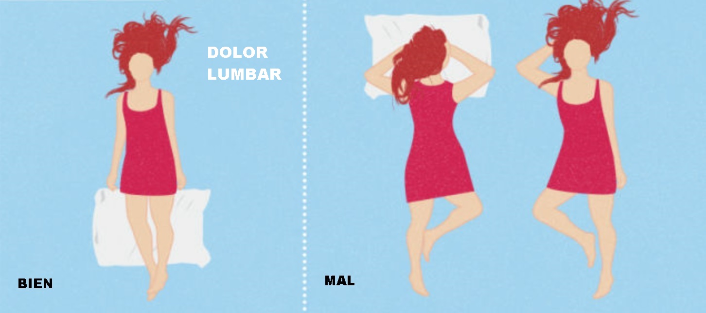 Dolor lumbar - Bien: Boca arriba, con la almohada situada debajo de las rodillas para minimizar el arqueo de las lumbares. Mal: Boca abajo o boca arriba sin almohada debajo de las rodillas.