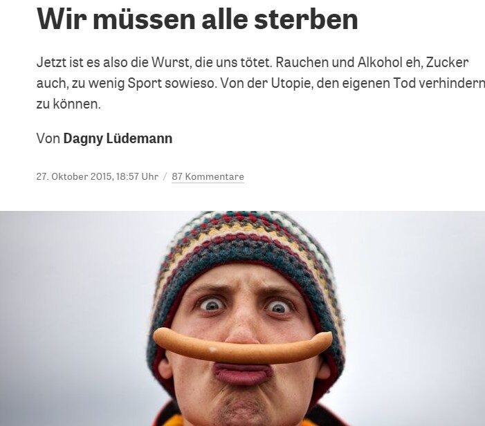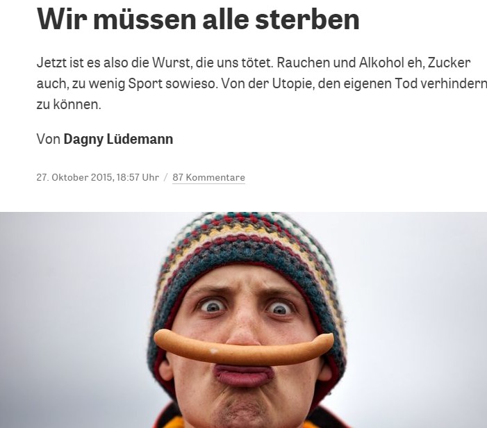 La prensa local se ha llenado de análisis y opiniones de expertos refutando o dando la razón a los especialistas de la OMS y de noticias valorando el impacto económico en el sector cárnico. También hay artículos que se toman el asunto con humor: el semanario Die Zeit titula, con una fotografía de una salchicha, "Vamos a morir todos". Y profundiza en el alarmismo de la OMS señalando cómo, tras mensajes como éste y el impacto que ha creado, se esconde la creencia de que la muerte es algo que puede evitarse y no algo que llegará de una forma u otra. En esa disyuntiva, el periodista se sitúa más del lado de los amantes de las salchichas y la cerveza y no con los alemanes, cada vez más numerosos, que consumen sólo alimentos biológicos. Pone como ejemplo el pragmatismo de un ministro "verde" de Baden Württemberg, que con el objetivo de defender la poderosa industria cárnica de su región, ha dicho en las últimas horas que "si te comes un saco de patatas de una sentada, también te mueres".